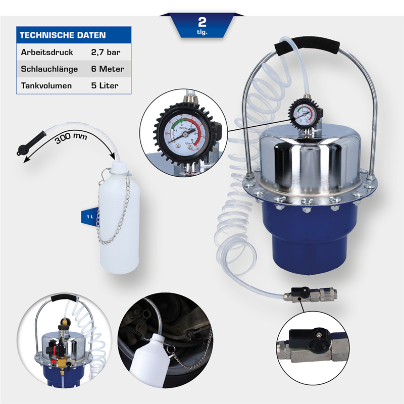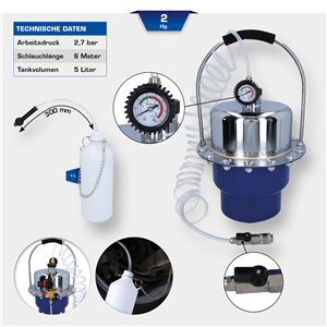 BRILLIANT TOOLS naprava za odzračevanje zavor s stisnjenim zrakom BT701260 služi odzračevanju in zamenjavi tekočin v zavornih in hidravličnih sistemih. Tako je mogoče tekočino zavornega sistema zamenjati v nekaj minutah, ne da nastane nevarnost zračnih mehurčkov. Delovni tlak je mogoče regulirati s tlačnim regulatorjem, nameščenim na 5-litrskem visokotlačnem rezervoarju, od 0 do 3 bar in odčitati na manometru. 1-litrska prestrezna steklenica za zavorno tekočino, ki se izpusti na odzračevalnem nastavku, je priložena obsegu dobave.